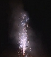 Вначале из верхней части пиротехнической батареи вырывается мощный поток огненно-золотых искр, переходящий в трескучие разрывы золотыми же бенгальскими искрами, вперемешку с красными светлячками;
